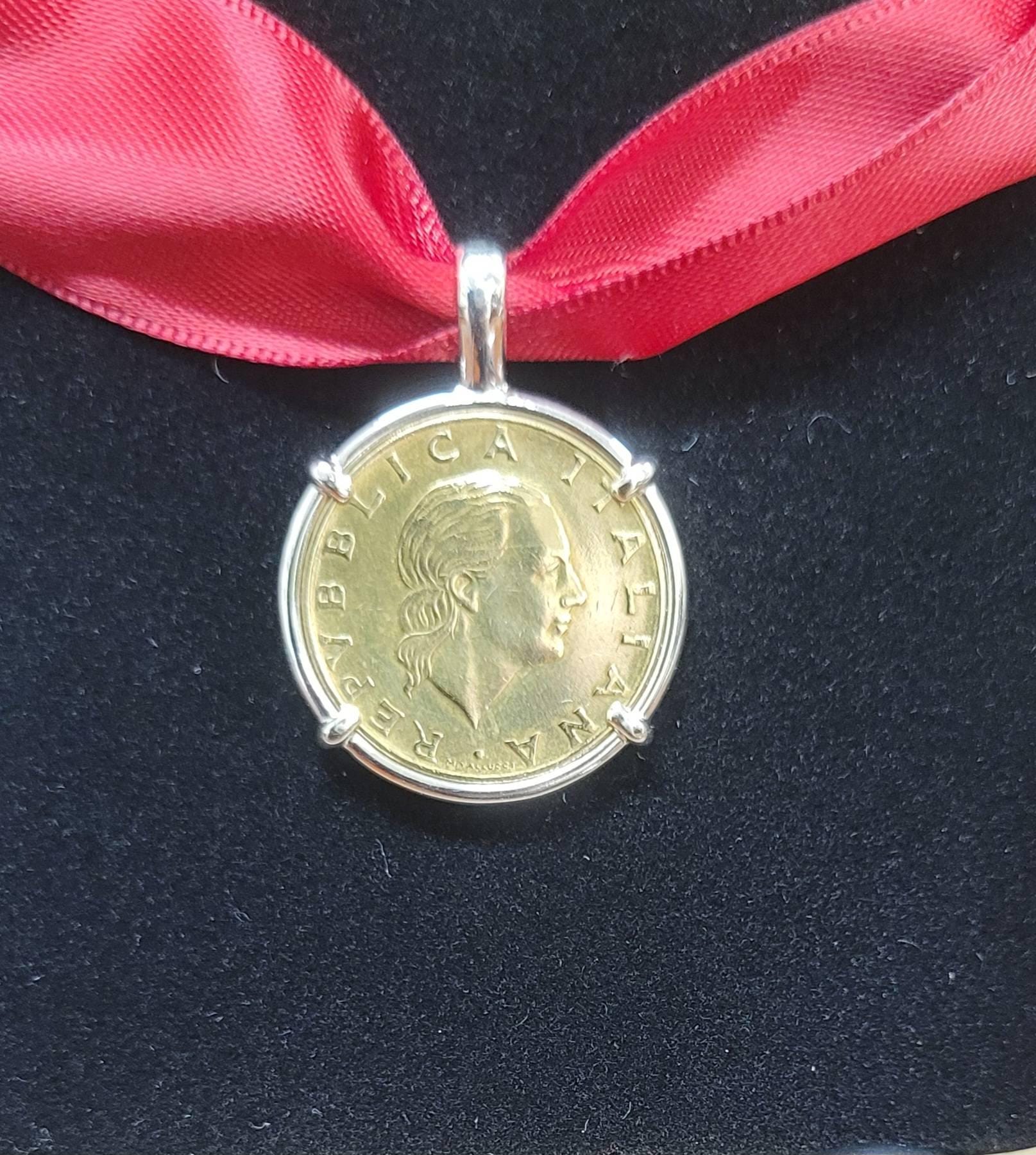 This piece is handmade to order and will ship within one week of payment.Vintage Italy 200 Lire (1977-2001) in handmade sterling silver pendant setting, stamped with my maker's and metal purity (925) mark on the bail's interior.