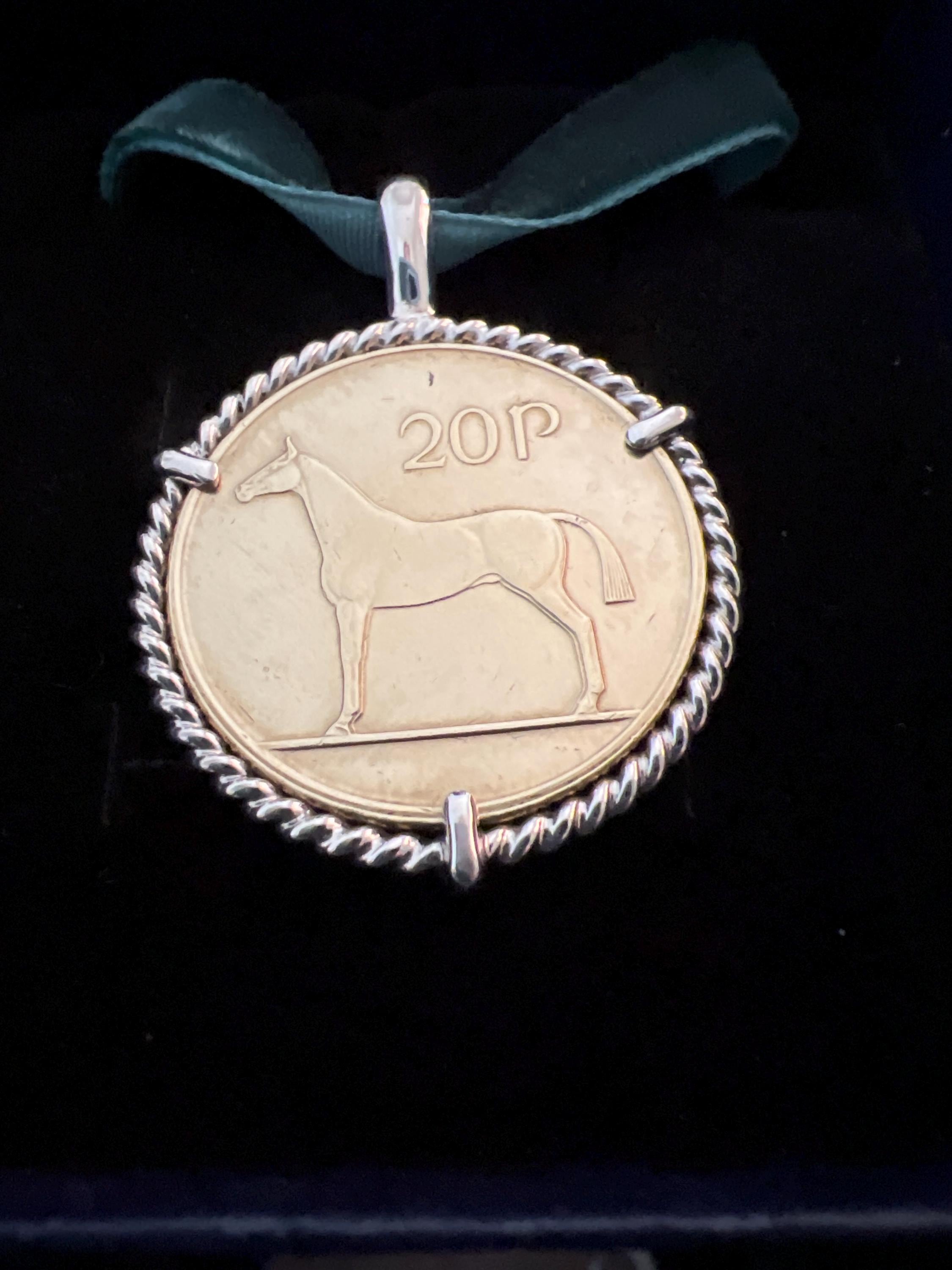 Vintage Ireland 20 Pingin in handmade sterling silver pendant setting, stamped with my maker's and metal purity (925) mark on the bail's interior.