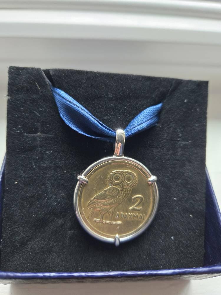As of 12/12/25, Christmas orders are not available. The Etsy estimated delivery dates are incorrect. The processing time for made-to-order items is a week. Your order will arrive after Christmas. This piece is handmade to order and will ship within one week of payment.Vintage Greece 2 drachmae in handmade sterling silver pendant setting, stamped with my maker's and metal purity (925) mark on the bail's interior
